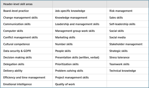 The header-level skill areas list describe potential areas for your development needs. Already making the header list makes you better aware of your possible development areas. Be open minded. Do not exclude anything you feel might be important for you in your work. Below is an example list. Mind you, these are just some examples. Everyone’s list is individual; your list can be longer or shorter and have content that is different from the example list below.