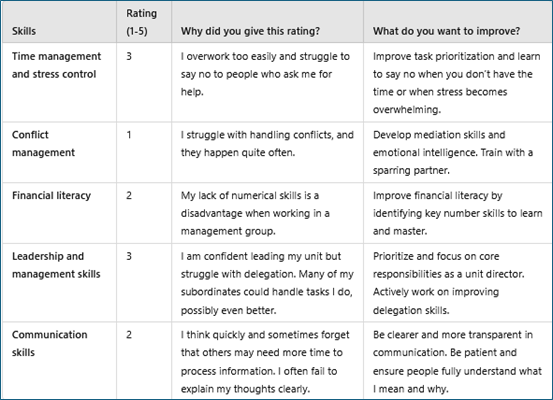 When the header-level list is ready you then prioritize and focus on which areas are most relevant for you in this moment in time. Rate yourself on a scale of 1 (= Absolutely needs improvement) to 5 (= Expert) for each selected skill. Then, briefly describe why that rating and how you want to develop further in this particular area. You can create a worksheet like this in Excel, or if Excel is not your thing, you can just as easily do this with a pen, ruler and grid paper. As the text space in a worksheet is limited, focus on short clear statements. You can then later on be more specific and detailed about the subject in an attachment. An example of a more detailed description is shown below this worksheet concerning the skill area “Financial literacy”.