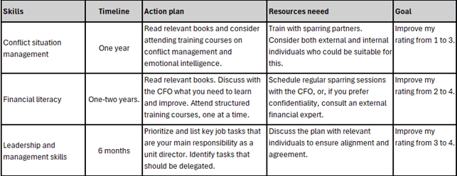 You now have an overview of your development needs. You have now also prioritized your development needs in Step 2 above. Now create a time-wise plan and roadmap for how to go about them, like below, a step-by-step action plan for the skill areas you have prioritized. Remember, learning and developing take time. Sometimes years. If needed, you can be more detailed about the subject in an attachment.